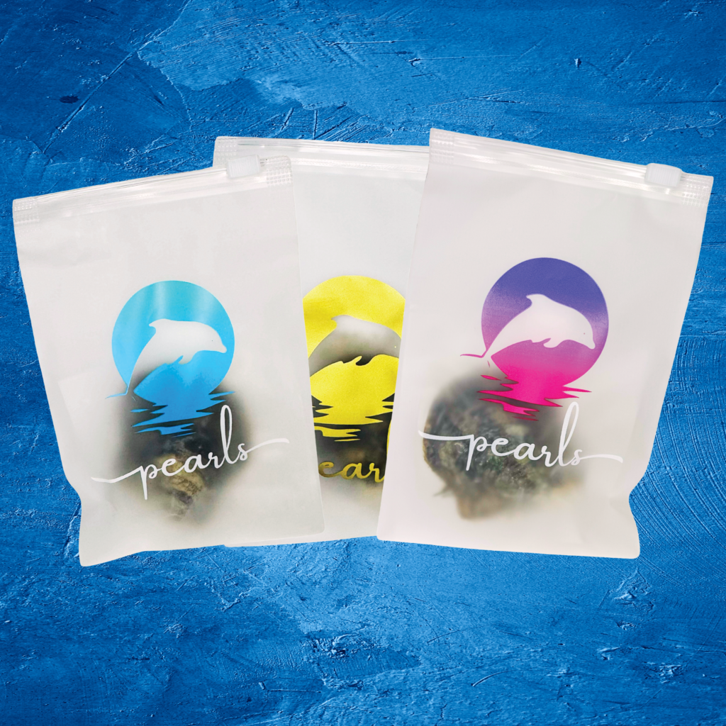 Tropical Color Splash pearls feature a vibrant mix of cultured Akoya pearl. Each oyster reveals a surprise, with pearls ranging from shades of soft and vibrant pinks, yellow, aqua and teal, deep blue, purple, red, and black. There’s even a chance to find more than one pearl!